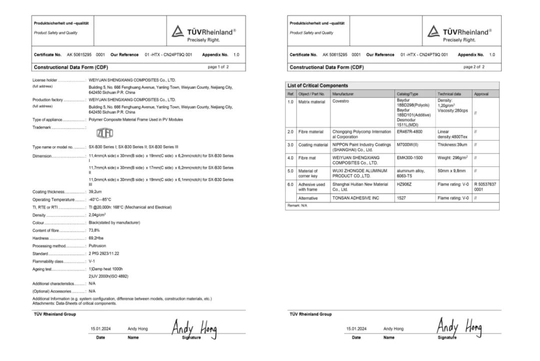 本次認(rèn)證的系列聚氨酯光伏邊框制品,通過了德國萊茵TüV 公司2PfG2923尺度認(rèn)證,在耐老化測試、阻燃性能、力學(xué)性能、耐鹽霧測試等全周期測試中體現(xiàn)優(yōu)異,該證書的獲得是對威遠(yuǎn)盛祥復(fù)合原料有限公司高質(zhì)量制造能力的認(rèn)可。