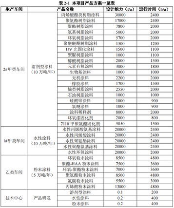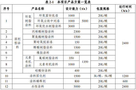 項(xiàng)目建成后,年產(chǎn) 5000 噸環(huán)氧樹脂涂料、2300 噸丙烯酸樹脂涂料自結(jié)皮、1500 噸聚氨酯樹脂涂料、150 噸聚硅氧烷面漆、1500 噸醇酸樹脂涂料、500 噸橡膠涂料、1350 噸元素有機(jī)涂料、1500 噸涂料固化劑、800 噸涂料稀釋劑、400 噸硅酸鋅涂料、5000 噸水性涂料。