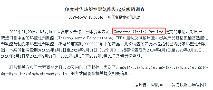 熱塑性聚氨酯(TPU) 值得關注的是,申請對原產于或進口自中國的熱塑性聚氨酯啟動反傾銷的發(fā)起者居然是科思創(chuàng)(印度)公司科思創(chuàng)(印度)以中國與印度生產的貨物完全相同,且技術規(guī)格、質量、功能和用途方面無一直插,且科思創(chuàng)(印度)是印度唯一的TPU生產商,占印度生產量100%為由,提交申請。